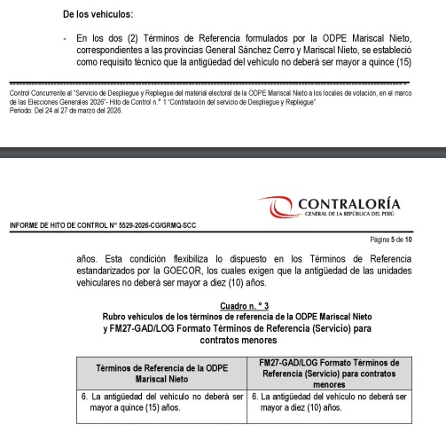 Pero la oficina de Ica no sería la única en realizar este tipo de cambios. En la provincia de Mariscal Nieto, la Oficina Descentralizada de Procesos Electorales también tomó la decisión de dejar de lado lo establecido por la Gerencia de Organización Electoral y Coordinación y amplió el requisito de antigüedad de vehículos que contratarían para la jornada electoral.