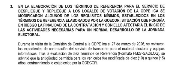 En otra situación insólita, la Oficina Descentralizada de Procesos Electorales de Ica realizó una extraña modificación en los términos de referencia para la contratación del servicio de transporte que tendría bajo su responsabilidad entregar el material necesario para instalar las mesas de votación.