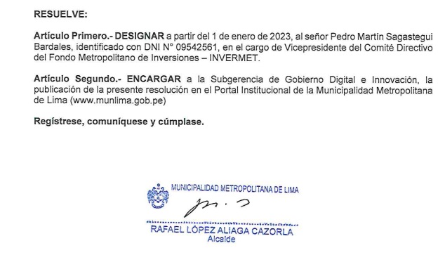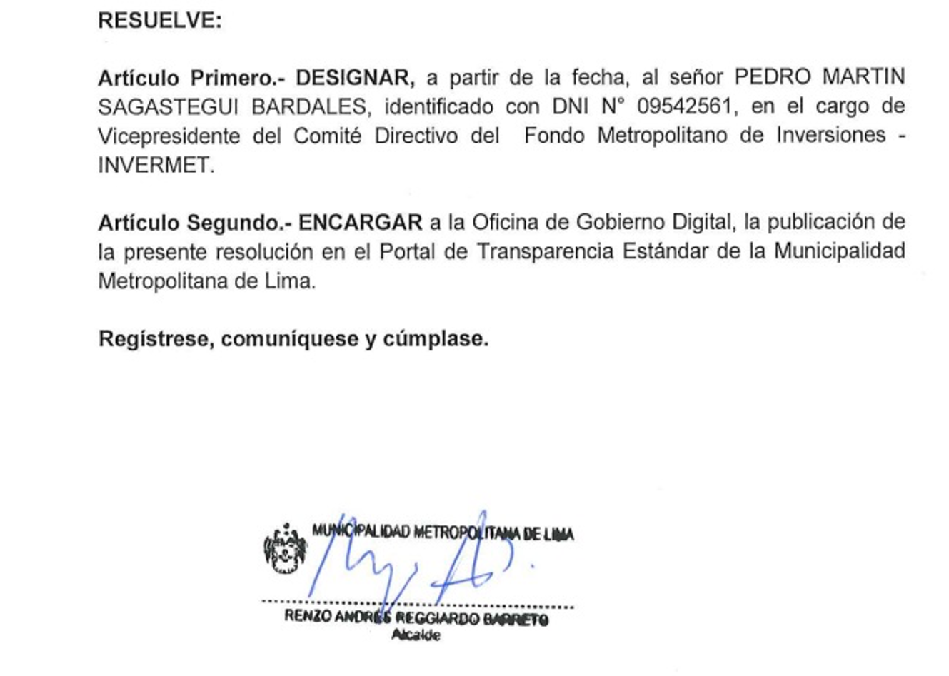 Con tan sólo unos días en el cargo, más precisamente el 22 de octubre, el nuevo alcalde de Lima designó al vicepresidente del comité directivo del Fondo Metropolitano de Inversiones (INVERMET). Renzo Reggiardo optó por Pedro Martín Sagástegui Bardales para ocupar dicho cargo.