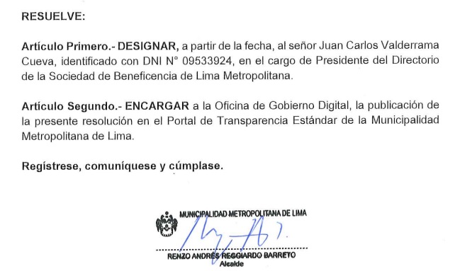 Renzo Reggiardo parece haber llegado a la alcaldía de Lima con una agenda propia, aunque esta tendría algunos beneficiados muy particulares. En las últimas semanas del mes pasado, el actual encargado del despacho municipal designó a Juan Carlos Valderrama Cueva como el nuevo presidente del directorio de la Sociedad de Beneficencia de Lima Metropolitana.