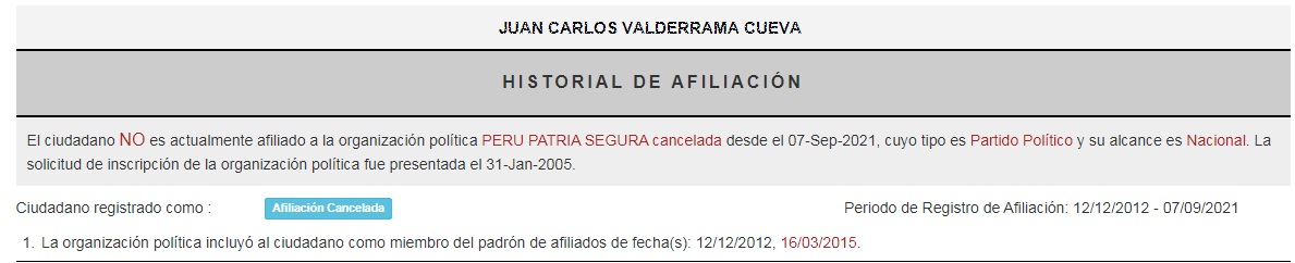 Juan Valderrama puede ser un nombre desconocido para la mayoría de peruanos, pero registra un pasado muy cercano al alcalde Reggiardo. Según la información que pudo revisar Sudaca, este personaje, que ha sido una de las primeras designaciones de Reggiardo en su nuevo cargo, estuvo afiliado a Perú Patria Segura, el partido que manejaba el teniente alcalde de López Aliaga.
