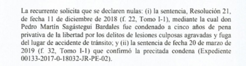 En el documento que se expuso, el nombre de Pedro Sagastegui no sólo figura como responsable de haber atropellado y abandonado el lugar del accidente sino que también detalla que este personaje fue condenado a cinco años de pena privativa de la libertad por sus acciones.