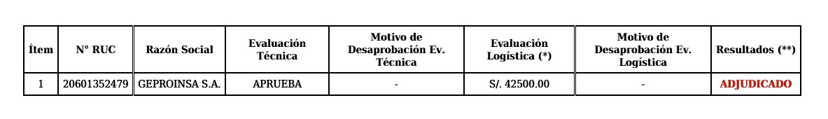 Esta convocatoria terminaría apenas un día después y quien se adjudicó esta orden de servicio fue la única oferta que figuraba en los documentos de la convocatoria. La empresa GEPROINSA S.A. fue la elegida para realizar las presentaciones artísticas solicitadas por la Municipalidad de Lima y recibiría S/. 42,500 por ello.