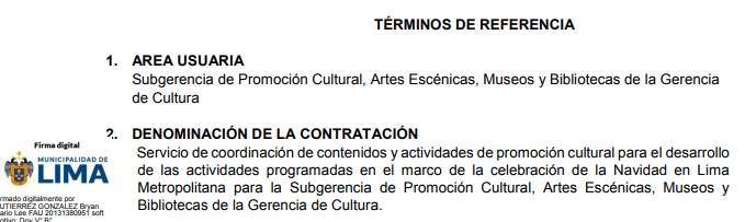 En el documento al que tuvo acceso Sudaca se puede leer que el propósito de dicha contratación a cargo de la Subgerencia de Promoción Cultural, Artes Escénicas, Museos y Bibliotecas fue organizar y desarrollar actividades artísticas de alta calidad, como la interpretación de villancicos andinos y muestras de danzas tradicionales para fortalecer la programación cultural navideña.