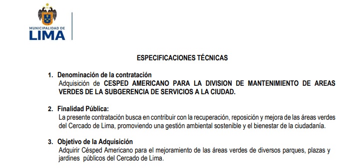 En una convocatoria publicada el 26 de noviembre, la Municipalidad de Lima puso en conocimiento su intención de adquirir césped americano para diversas áreas verdes del Cercado de Lima y se pusieron a disposición los mecanismos correspondientes para la recepción de ofertas.