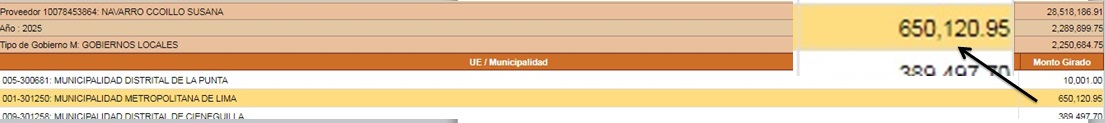 No obstante, al indagar sobre los contratos que ha tenido Navarro Ccoillo este 2025, se puede encontrar que la suerte no sólo estuvo de su lado en el distrito de Ate. Acorde a la información del portal Transparencia Económica, la empresaria protagonista de esas sospechosas ofertas presentadas a la Municipalidad de Ate también facturó más de seiscientos cincuenta mil soles con la Municipalidad de Lima.