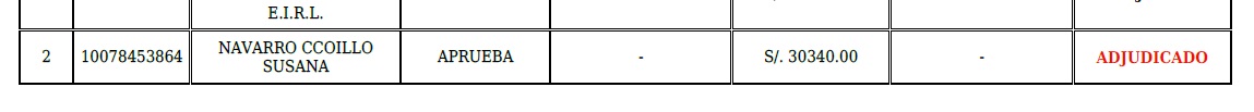 Apenas dos días después, la Municipalidad de Lima eligió a quien se le adjudicaría esta contratación. Tal como se puede apreciar en la siguiente imagen, Susana Navarro Ccoillo fue nuevamente la afortunada con este contrato que supera los treinta mil soles por más de cuatro mil metros cuadrados de césped americano.