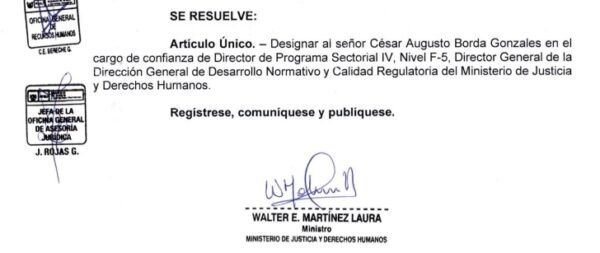 Aunque el gobierno de José Jerí intenta proyectar una imagen muy distinta a la de su predecesora, en las designaciones de la gestión actual todavía se pueden encontrar nombre que dieron que hablar en el pasado. Este sería el caso de César Augusto Borda Gonzales, quien la semana pasada fue designado por el ministro de Justicia como director general de la Dirección General de Desarrollo Normativo y Calidad Regulatoria.