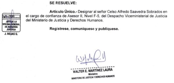 Pero la suerte no sólo parece haberle sonreído a esta exasesora y aportante del partido de José Luna. El lunes 17 de noviembre, a menos de una semana de su designación como viceministra, Valdez Tejada nombró en el cargo de confianza de asesor de su despacho a Celso Alfredo Saavedra Sobrados.