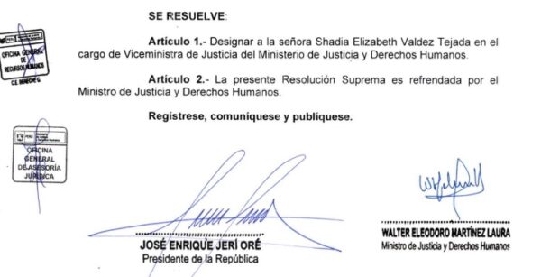 El pasado miércoles 12 de noviembre, en un documento que lleva las firmas del presidente José Jerí y el ministro Walter Martínez, el Ministerio de Justicia y Derechos Humanos hizo oficial la designación de Shadia Elizabeth Valdez Tejada en el cargo de viceministra de este sector.