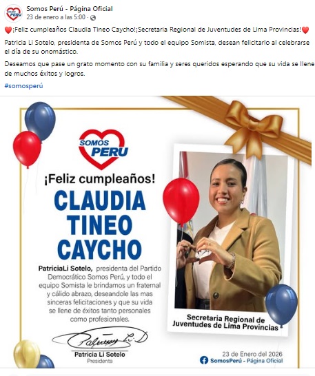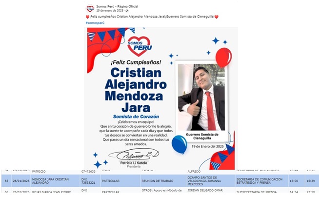 Esta información podría resultar desconcertante. No obstante, Sudaca encontró un dato extra sobre Tineo Caycho que podrían explicar estas visitas. La joven odontóloga, al igual que el presidente Jerí, pertenece a las filas de Somos Perú. Tineo, además, no es una simple militante sino que ocupa el cargo de secretaria regional de juventudes de Lima provincias.