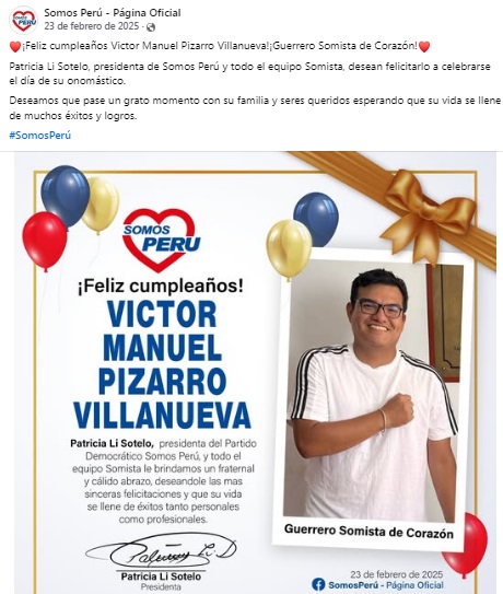 Por supuesto, al igual que Tineo Caycho y Gonzáles Nalvarte, Pizarro tiene algo que lo vincula al actual presidente. Como lo deja en evidencia la propia publicación del partido en sus redes sociales, se dio la casualidad que Víctor Pizarro Villanueva también pertenece a las filas de Somos Perú.