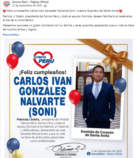 Según la información que pudo obtener Sudaca, Gonzáles es un ingeniero ambiental. Pero, casualmente, también proviene de las filas del Somos Perú. En la siguiente publicación con motivo de su cumpleaños, que deja en evidencia su importancia dentro del partido, incluso se le puede ver en los pasillos del Legislativo.