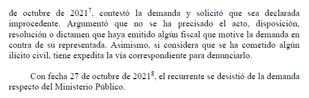 La inexplicable inclusión del Ministerio Público entre las partes demandadas llevó a que su procurador público señale que no se había precisado qué acto cometido por un fiscal justificaba dicha demanda pero que, si consideraba que se había cometido algún acto ilícito, contaba con las vías correspondientes para denunciar. Ante esta respuesta, y tan sólo unos días después, Rodríguez Andonaire desistiría de la demanda al Ministerio Público.