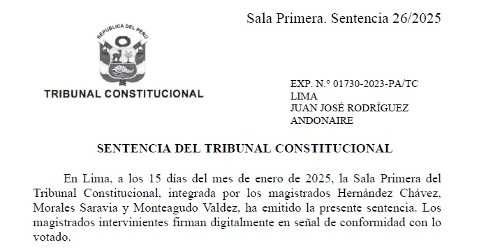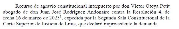 Esta sentencia del Tribunal Constitucional, que data del año pasado, atiende un recurso de agravio constitucional interpuesto por el abogado de Rodríguez Andonaire contra una resolución de la Segunda Sala Constitucional de la Corte Superior de Justicia de Lima que años atrás había declarado improcedente la demanda presentada por Rodríguez.