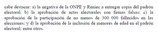 Con un discurso casi idéntico al que se propagaba desde el bunker de Fuerza Popular, la demanda de Rodríguez repetía que las firmas de las actas electorales eran falsas, hacía mención de una inclusión de menores de edad en el padrón electoral y hasta señalaba que trecientos mil fallecidos participaron de las elecciones.
