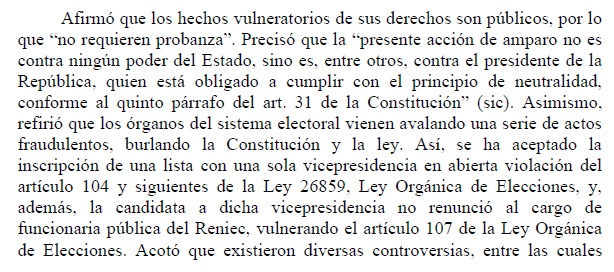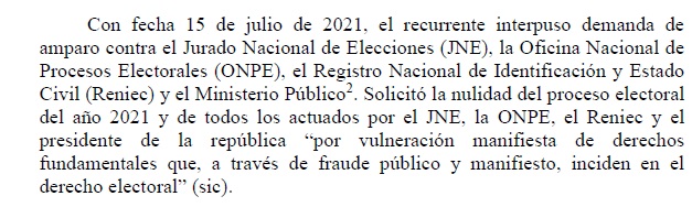 La demanda interpuesta por el actual candidato al senado no aportaba pruebas alegando que “los hechos vulneratorios de sus derechos son públicos” y hasta acusaba al entonces presidente, Francisco Sagasti, de incumplir con el principio de neutralidad. Para Rodríguez Andonaire, los órganos del sistema electoral habían avalado una serie de actos fraudulentos.
