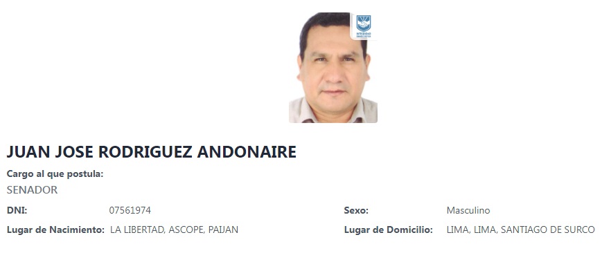 Juan José Rodríguez Andonaire es el nombre de este candidato que pretende convertirse en uno de los integrantes de nuevo senado como parte de Integridad Democrática. Acorde a la información disponible, este aspirante a senador no cuenta con historial político y apenas registra un pasado de pocos años como comerciante en el rubro textil.
