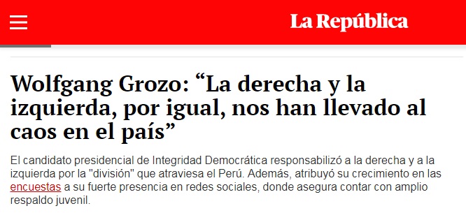 Uno de los que ha querido colgarse este cartel ha sido Wolfgang Mario Grozo Costa, un general en retiro que supo integrar las filas de la Fuerza Aérea del Perú. Con un discurso que lo mostraba como un crítico tanto de la derecha como la izquierda, Grozo empezó a figurar entre los principales aspirantes a la presidencia respaldado, especialmente, por el votante juvenil.