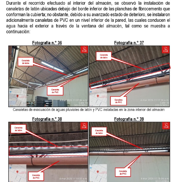 La presencia de humedad tanto en el almacén como en los bienes que ahí se acumulan no sorprende tanto el deterioro y la improvisación del lugar. Como lo muestran las imágenes, pese a que se sabe que la región suele ser afectada por fuertes lluvias, el local cuenta con canaletas de latón para la evacuación de la lluvia que se encuentran en un innegable estado de deterioro y, como solución improvisada, han colocado otra fila de canaletas.
