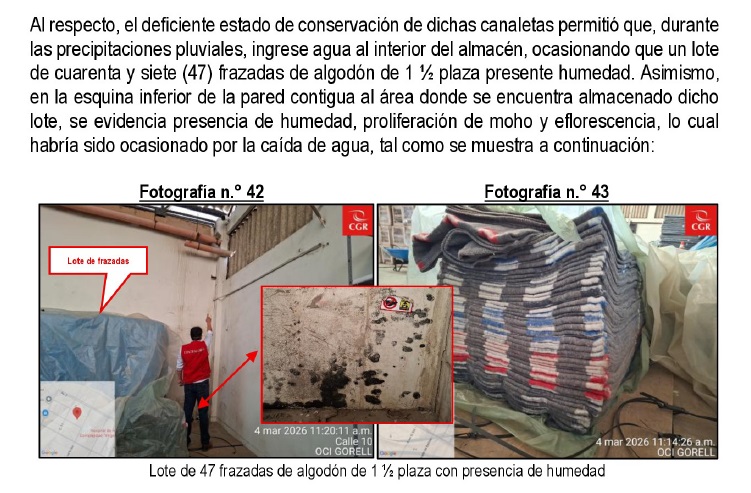Este tremendo descuido que la comisión encargada de la visita de control encontró ya ha dañado a algunos de los bienes que se almacenan en este lugar. Según el informe, cuarenta y siete frazadas de algodón destinadas para ayuda humanitaria han sido perjudicadas por la humedad.