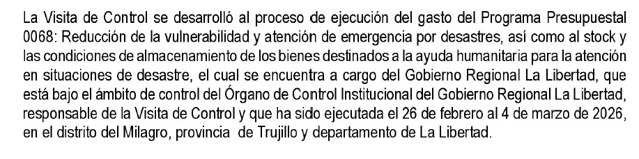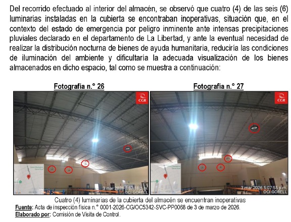 Entre los últimos días de febrero y los primeros del presente mes se llevó a cabo una visita de control que tenía como objetivo de revisar cuál era la situación de los bienes destinados para ayuda humanitaria en casos de desastres. El responsable de mantener las buenas condiciones así como el stock adecuado era el Gobierno Regional de La Libertad.