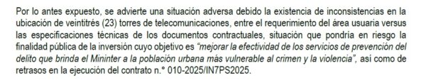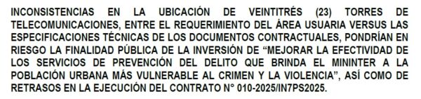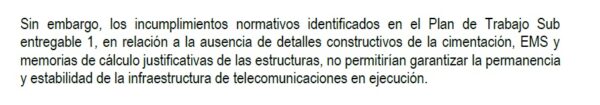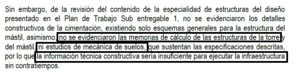 Sin embargo, el pasado mes de septiembre, la Contraloría detectó una serie de alarmantes problemas que perjudican la finalidad de este proyecto. Acorde al documento revisado por Sudaca, en el plan de trabajo para la instalación de estas antenas repetidoras no se encontraron estudios del terreno donde se iban a instalar ni la información pertinente para la estructura de la torre. Como se observa en la siguiente imagen, la ausencia de esta información era “insuficiente para ejecutar la infraestructura”.