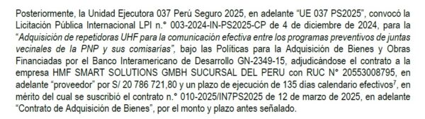 Días después, la licitación pública fue convocada y se obtuvo un proveedor que recibiría más de veinte millones de soles por la adquisición de estos aparatos tecnológicos que facilitarían la comunicación entre las juntas vecinales y las cuarenta comisarías que se verían beneficiadas con este proyecto.
