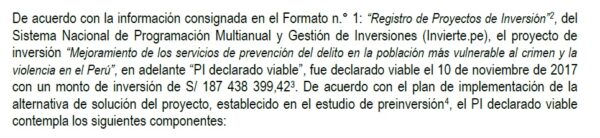 Es en este contexto que Sudaca ha podido acceder a documentos sobre un ambicioso proyecto de inversión que evidencia, una vez más, los malos manejos por parte de las autoridades encargadas. Para ello es preciso remontarse al año 2017 cuando se declaró viable un proyecto de inversión que tenía como objetivo el “mejoramiento de los servicios de prevención del delito en la población más vulnerable al crimen” y para el cual se destinaron cerca de doscientos millones de soles que salieron de un préstamo con el Banco Interamericano de Desarrollo (BID).