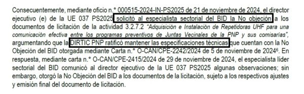 El siguiente capítulo de este proyecto tuvo lugar en noviembre del año pasado cuando se le solicitó al especialista del Banco Interamericano de Desarrollo que otorgue la no objeción a los documentos correspondientes al proceso de licitación. La Dirección de Tecnología de la Información y Comunicaciones de la Policía Nacional del Perú justificó este pedido alegando que habían mantenido las especificaciones técnicas anteriormente aprobada por el Banco Interamericano de Desarrollo.