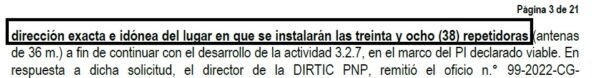 Como parte de este proyecto de inversión se había previsto la instalación de antenas repetidoras que respondían al objetivo denominado “Implementación de los Sistemas de Comunicación entre las Juntas Vecinales y la Comisaría”. Con este objetivo, en mayo del 2022 se le solicitó a la Policía Nacional del Perú que indique dónde sería pertinente que se instalen estas antenas.