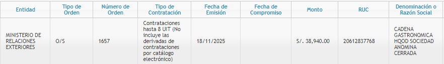 Aparentemente, para aliviar este clima de preocupación, la Cancillería no tuvo mejor idea que contratar los servicios de una cadena gastronómica. Por supuesto, al momento de invertir en dicha contratación no tuvieron reparos en destinar para este fin el monto que sea necesario y, por ello, para la contratación de Cadena Gastronómica HQOD se destinaron cerca de cuarenta mil soles.