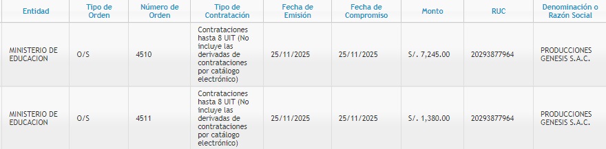 Sudaca pudo acceder a las órdenes de servicio que el Ministerio de Educación pagó durante el mes de noviembre y encontró, tal como se puede observar en la siguiente imagen, que el Minedu invirtió en la contratación de la empresa Producciones Génesis S.A.C. más de ocho mil soles.