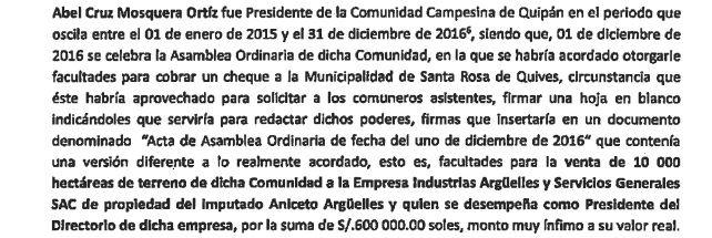 El accionar de Mosquera Ortiz consistió en aprovecharse de su condición de presidente de la Comunidad Campesina de Quipán para obtener las firmas de los comuneros e incluirlas en un acta que correspondía a una asamblea que nunca ocurrió y le permitiría venderle a Industrias Argüelles un terreno de diez mil hectáreas por seiscientos mil soles, un monto muy lejano al valor que le correspondería a un terreno de esa magnitud.