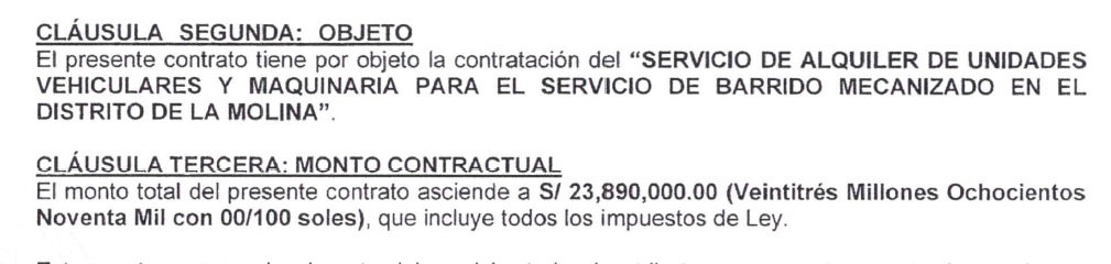 En el contrato entre la Municipalidad de La Molina e Industrias Argüelles, que durará hasta el mes de octubre del año 2027, se establece que por este servicio se realizará un pago de casi treinta millones de soles en favor de la empresa del condenado Argüelles Loayza por el alquiler de estos vehículos.