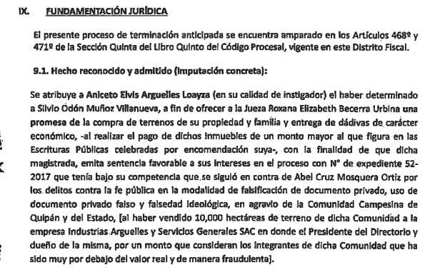 Como se ha detallado en otros informes publicados por Sudaca, Argüelles se encontraba implicado en el caso de la compra fraudulenta de un terreno de diez mil hectáreas que le pertenecían a la Comunidad Campesina de Quipán. Para lograr que la jueza Roxana Urbina Becerra tome una decisión en favor de sus intereses y los de su aliado Abel Cruz Mosquera Ortíz, el encargado de falsificar los documentos de la compra en cuestión, Argüelles, haciendo uso de intermediarios, gestionó el pago de sobornos a la magistrada que fueron disfrazados de compras de terrenos familiares.