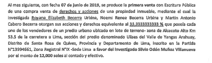 Durante los últimos días del mes de mayo se conoció que la sentencia de la magistrada Becerra para Abel Cruz Mosqueira Cruz serían cuatro años de pena privativa de la libertad suspendida y, tan sólo unos días después, se produjo la venta de un terreno que le pertenecían tanto a Roxana Becerra como a dos familiares más a Silvio Muñoz. Cabe señalar que a esta venta le siguieron varios encuentros para entregar elevadas sumas de dinero.