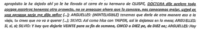 En esta llamada Muñoz también reconoce que le pidió a Becerra Urbina que “acelere todo” debido a que tenían otro proyecto pendiente y presume la complicidad lograda con la magistrada durante este encuentro. Muñoz, en esta conversación, le pide a Argüelles “dejarle veinte para su fin de semana”.