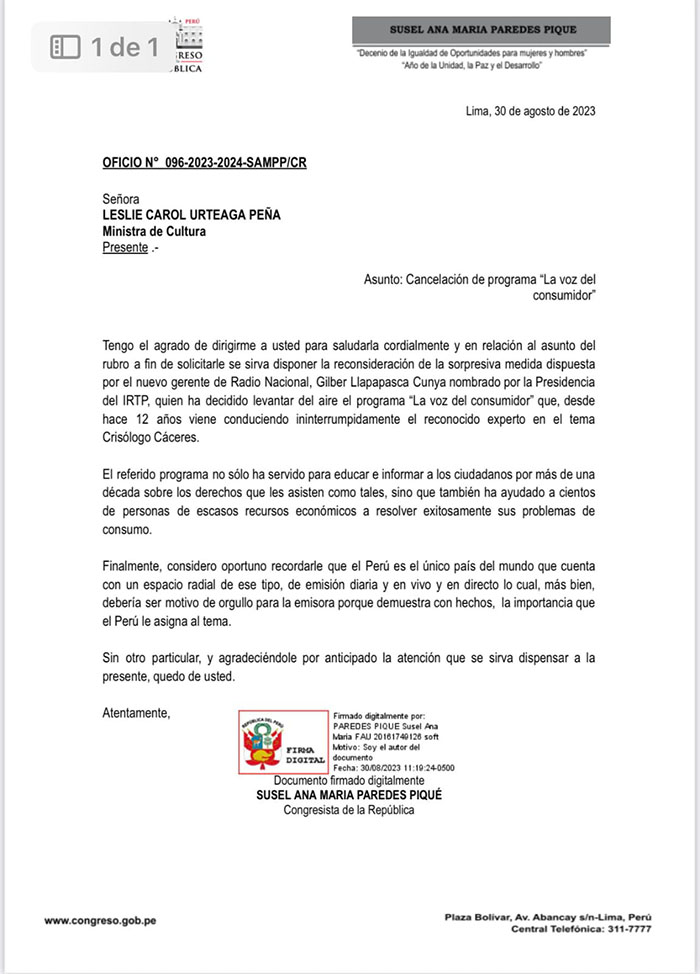 Espero que @IRTP_Oficial mantenga el tema en su parrilla con la independencia necesaria pic.twitter.com/BvF3V48yHE— Crisologo Caceres (@CrisoCaceres) August 31, 2023