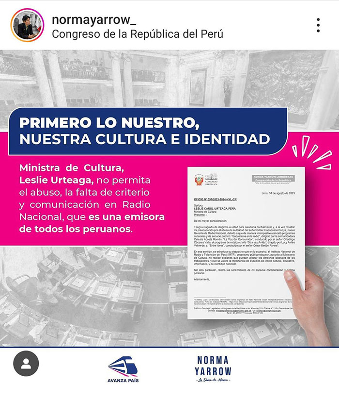 Norma Yarrow, parlamentaria de Avanza País, también se ha pronunciado y, en el oficio dirigido a la ministra Urteaga, ha calificado como abuso de autoridad la decisión de Llapapasca Cunya y exhortó al IRTP no realizar acciones que puedan afectar los derechos laborales de los trabajadores.